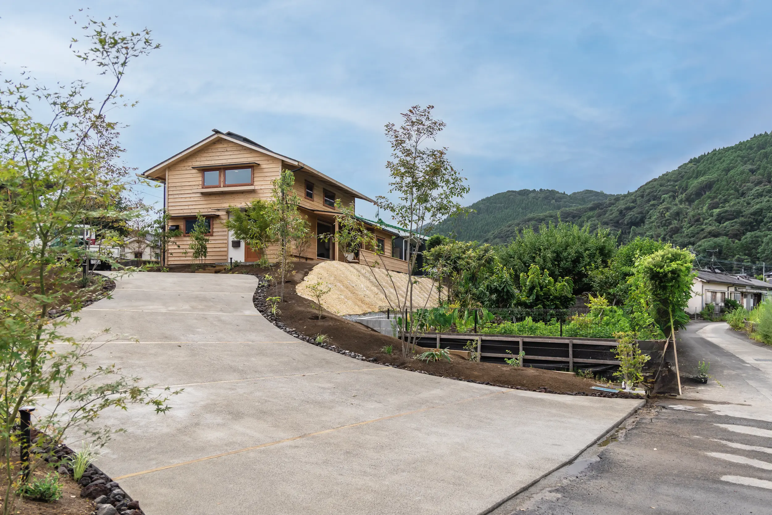 そんな難条件を一つ一つ紐解き、建物の配置を工夫することで、車をスロープで宅地まで上げる計画をご提案。“土地の魅力を最大限に活かすこと” “お二人が気に入ったこの土地となじみ、風景になる家をつくること”を、じっくりと考えて設計しました。