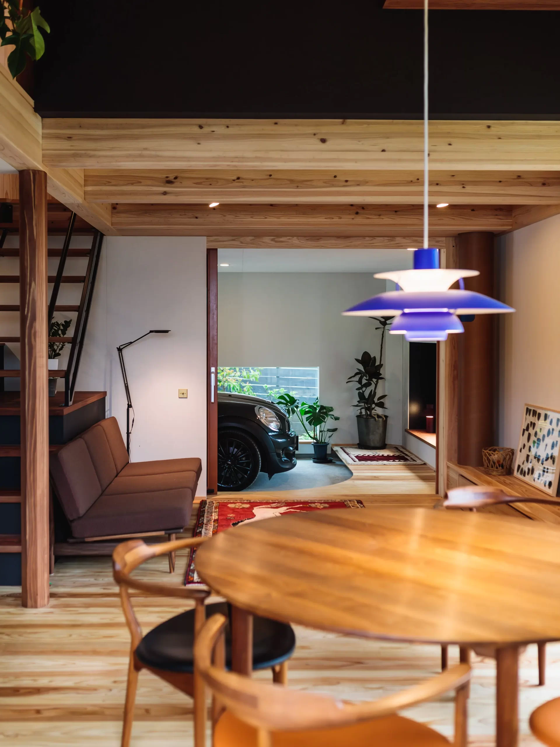 リビングから大きな窓で庭や空、ガレージへ空間が繋がる