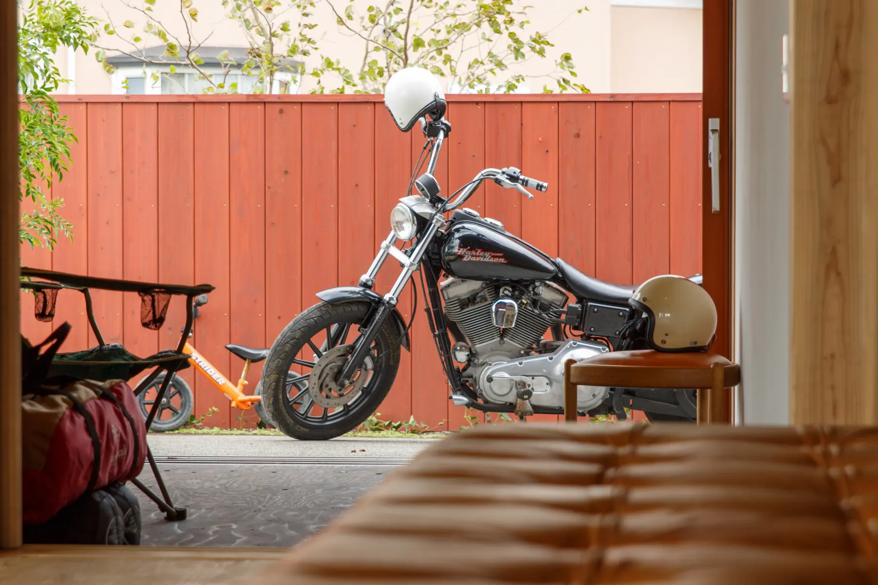 ご主人のバイクと向き合える小さなハナレ。